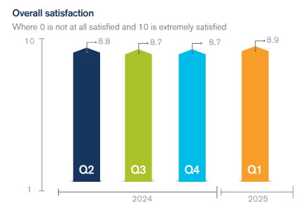 Members are asked to rate from 0 to 10, where 0 is not at all satisfied and 10 is extremely satisfied. Our target for our overall score is 8 or above.